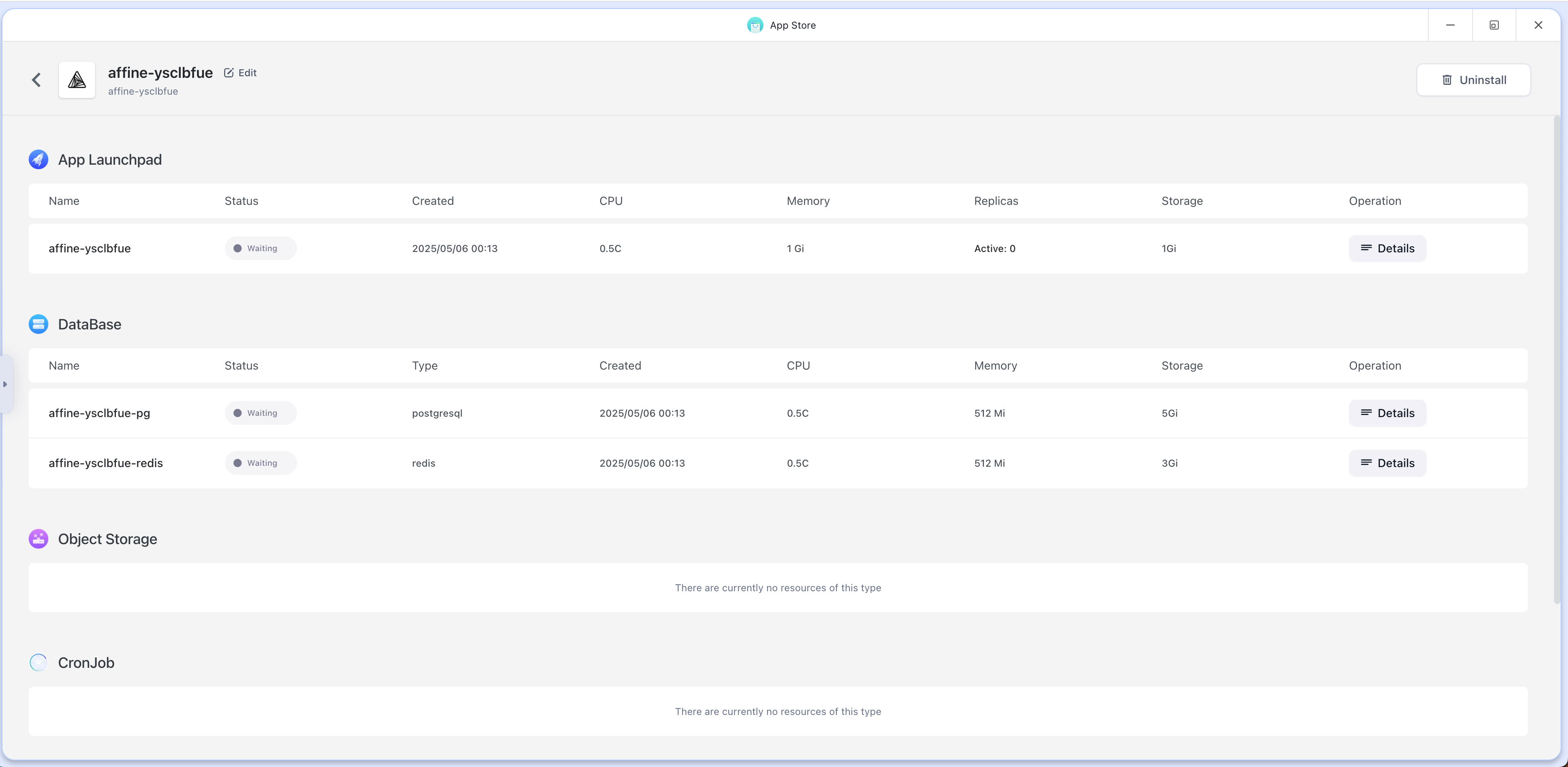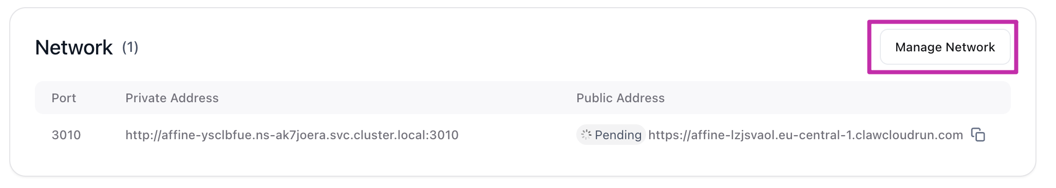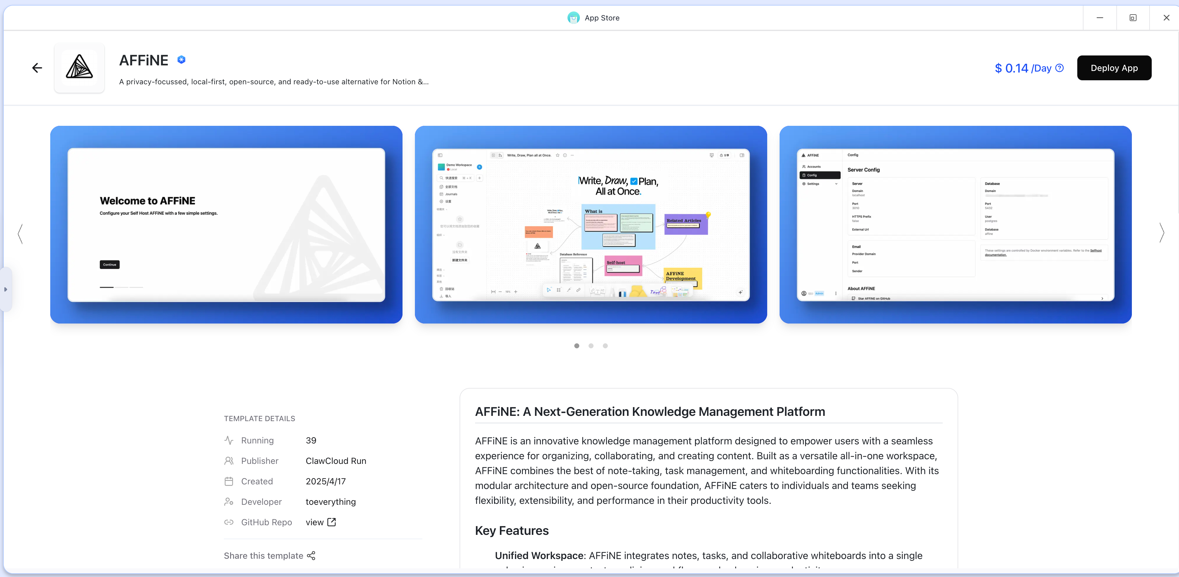 - Click Deploy App. After 3–5 minutes the container shows Running. Open the temporary URL—if you see the Affine setup screen, you’re good.